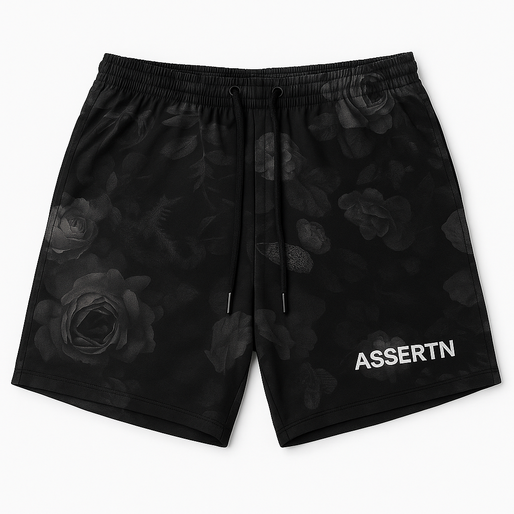 Rose Noir Shorts: Lightweight, breathable shorts with an all-over grayscale rose pattern, finished with subtle ASSERTN branding at the hem. Designed for comfort and edge in equal measure.