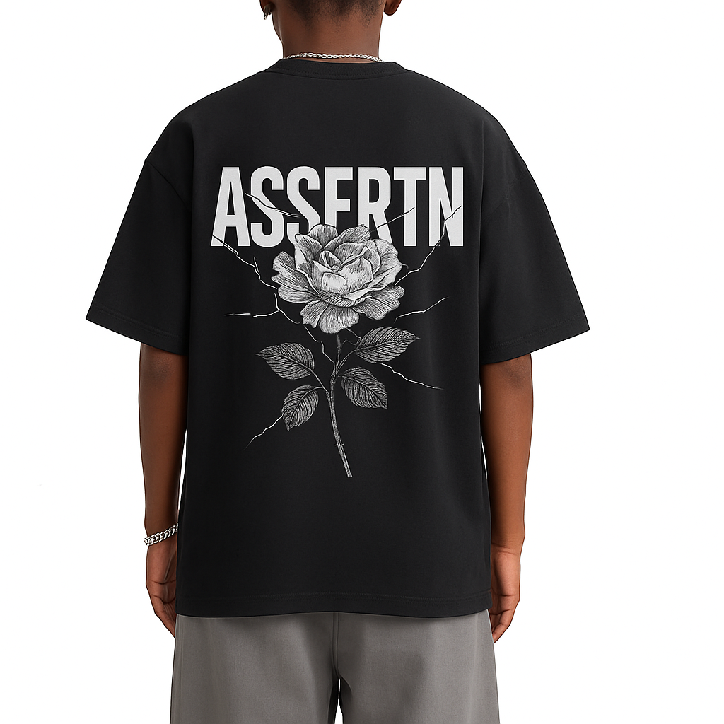 Concrete Rose Tee: An oversized heavyweight tee, printed with ASSERTN’s bold wordmark and centerpiece grayscale rose graphic — a symbol of strength rising through fracture.